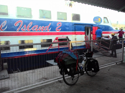 JUGEMテーマ:海外一人旅 4月28日 ジョージタウンのドミトリーホステルに滞在している。一週間も同じホステルにいた。 今日はここペナン島からランカウィ島(Langkawi)までフェリーで移動する。 フェリーは朝8時半の出港。昨日の夜ほぼ準備は済ませていたのでスムーズに出発。 8時前にはフェリーターミナルに着き搭乗手続き。 フェリーはこの旅始まって何回か使ったことがある。いつも甲板に自転車と一緒に乗らせてもらっていた。 しかし、係員が 「荷物はすべて外して...