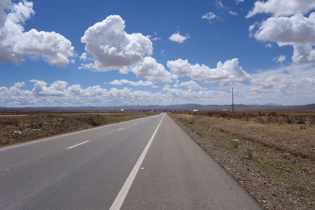 JUGEMテーマ:海外一人旅 11月17日 昨日はJuliという町に着き、宿にチェックイン。 今日はPeru(ペルー)を出国し、Bolivia(ボリビア)に入国する予定。 ここから国境までは約50km。3S号を南東へ走り左折、130号にのる。多分平坦な道。 昨日ペルーの硬貨を使い切ってしまったので、朝ごはんは手持ちの食料で済ます。 残っているペルー紙幣はボリビア入国後、ボリビアのお金に両替する予定だ。 出発。 町を出て3S号にのる 今日もチチカカ湖沿...
