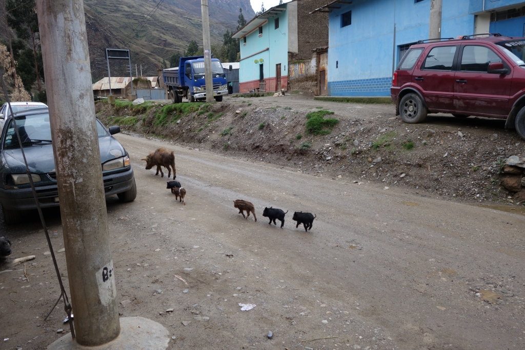 JUGEMテーマ:海外一人旅 10月29日 昨日はTingo Chicoという村に着き、宿にチェックイン。 朝起きて宿の外に出ると イノシシ一家通行中 ここは久しぶりの標高3000m未満。 近くの露店で朝ごはん。何かの動物の頭の入った煮込みスープ。 今日も走る。3号を南東へ進む。ヒルクライムだ。 出発。天気は曇り。 渓谷に沿った道を上っていく。道の横には川(Rio Maranon)。 走り出すと、すぐに未舗装路になった。水と相性の良い路面のようで、昨...