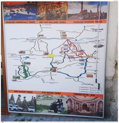 午前中にホテルに着いたので、スーツケースを預かってもらって早速出かけます。 どうやって“奇岩”を見に行こうか考えました。 この通り、レッドツアー、ブルーツアー、グリーンツアーの3つがメインで、どれも1日かかるそうなので、今日は一番エリアが近いレッドツアーのコースをタクシーを借りて、回ってもらうことにしました。 翌日は、ホテルをチェックアウトして移動ですが、夜のフライトなので、ブルーツアーに申し込みをしました。  タクシーの運転...