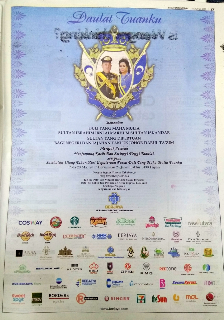 日本人って、日本人は金持ちだと思っているけど、実はマレーシアにもお金持ちは多いし、ケタはずれの大金持ちも結構いる。 ■ジョホール州のスルタン 例えば、これはある日の無料英字紙「The Sun」の誌面。 ジョホール州のスルタンの戴冠記念日が3月23日らしく、マレーシアの財閥「Berjayaグループ」が、新聞の1面を使って「おめでとうございます」と祝意をしたもの。 こちらがジョホール州のスルタンご夫妻。 新聞のインクの汚れが付いていますが……。 ジョホール州のスルタンは乗り物好きで有名で、ありとあらゆる...