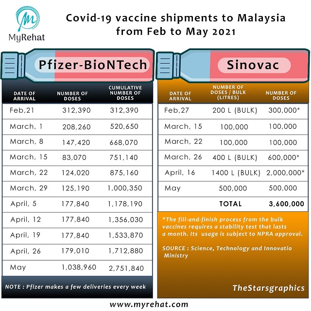 In May, Malaysia is scheduled to receive another 1,038,960 doses of the Pfizer-BioNTech vaccine and 500,000 doses of Sinovac vaccine.For information on vaccine rollout go to https://t.co/ntJjPPindB. A social service message brought by https://t.co/zzIVDCeGO0#vaccinecovid19 pic.twitter.com/QiDnPuDOeJ— MyRehat (@MyRehat) May 3, 2021 2月時点での発表ではマレーシアで使用されるワクチンのうちシノバックの割合は20%前後でしたが、上記の資料によれば5月時点では半分弱になります。 この他にアスト...