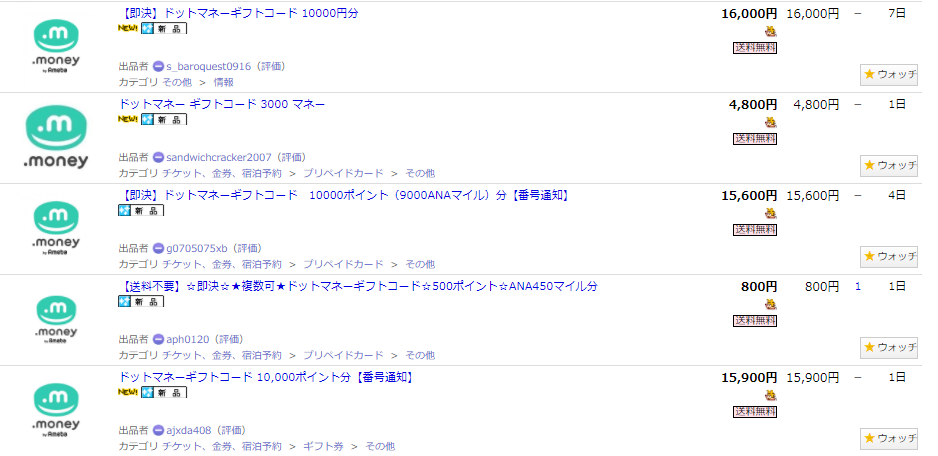 JUGEMテーマ:マイル、マイレージ Yahooショッピングなどの特典でもらえる期間固定Tポイントを使って ヤフオクでドットマネーギフトコードを購入してみました。 今回はYahoo Japan カードの入会特典の期間固定Tポイントを使っての購入です。 まず、ハピタス経由でヤフオクのページに入りドットマネーで検索します。 (ドットマネーギフトコードの購入でポイント付与されるかは、確認中) すると、ドットマネーギフトコードがいくつか出てきます。 持っているTポイントが5000...