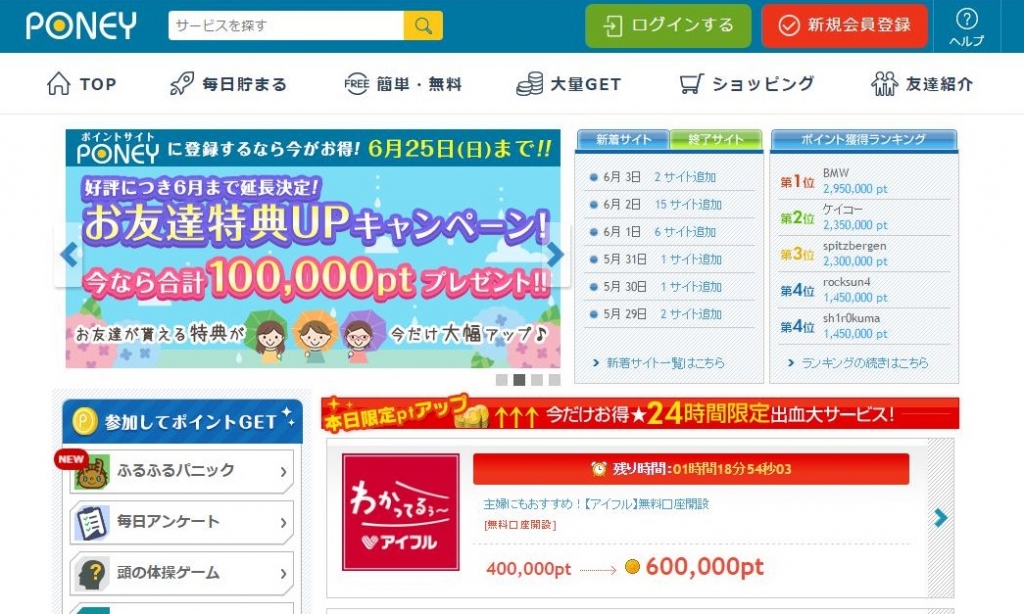 JUGEMテーマ:ポイントゲット、マイル、マイレージ 前回の記事で、4つのポイントサイトについて紹介しましたが、今回の記事では PONEYの紹介をします。 ■PONEYのトップページ PONEYでは、他のポイントサイトと同様にクレジットカード、FX、ショッピング、ゲーム、アンケートなどで ポイントを貯めることができます。 貯めたポイントはドットマネー、Amazonギフト券、楽天スーパーポイントなどに交換したり、 自分が持っているゆうちょ銀行、三菱東京UFJ...