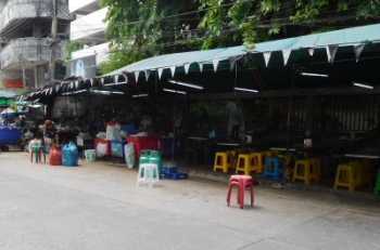 BTSでプルンチットへ。 今回の旅半分を終えて、ってか2日目にすでに気づいてしまった。今回の旅ではたくさんソムタムを食うつもりだったけど、人間には「適度」が大切だって。やっぱ落ち着くのはパッタイやカオパットなのかもしれん。 そんなわけでソイ1のガレージ食堂に行ってみた。店が2つ並んでいたのに誘われるがままに手前の店に。 店頭に並んだ食材も立派。でもやっぱベタなもんが食いたい。注文はシーフードのパッタイ、シーフード炒め、空芯菜炒め、スイカ...