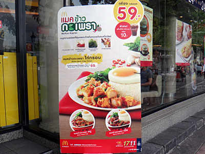 タイのマクドナルドでここしばらく続いてるご飯ものメニューMcKao。 今年はガパオ(バジル炒めご飯)でした。 単品で59THB。コーラとセットで+10THB。タマゴ(目玉焼き)のトッピングも+10THB。 チキンとビーフ、ポークの3種類が選べる。もちろん、それぞれバーガーのパテを刻んだものだ。それにソースを絡めて、揚げたバジルをトッピングしてでてくる。 さっそく注文してみた。 チキン ビーフ ポーク こうやって並べて見ると、作る店員によってバジルの量が違うなぁ。 あくまでも個人的な感想だが、チキ...