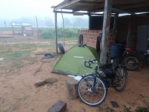 日付:2019年6月29日(土) 天気:晴れ 移動距離:なし(自転車では) 総移動距離:25,781km 本日の移動:タタレンダ→サンタクルス 朝はかなり気温が下がった。 その影響でテントの外は濃い霧に包まれている。 もちろんテントも水滴でびっしょり。 しばらく乾燥したエリアだったので こんなのも久しぶりだ。 さて、改めて自転車を確認する。 ん〜、壊れたのは夢ではなかったようで。 自転車での移動はやはり不可能。 ヒッチハイクを決意するも 辺りは霧に包まれて...