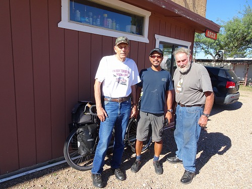 日付:2018年9月8日(土) 天気:晴れ 移動距離:81km 総移動距離:14,640km 本日の移動:Tombstone→Douglas 12時間くらい寝ていたような・・・。 ここ数日は大して走ってないから疲れてないと思うのに。 まぁ、テントでもこうしてぐっすり眠れるってことはいいことだ。 ボリューム満点の朝食をごちそうしてもらってから走り出した。 出発前の記念写真。ぼくの向かって右側にいるのがMoe。 このキャンプ場のオーナー。昨日は町の案内をしてくれた。 今日は土曜日だからなのか通りで...