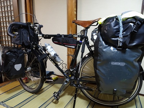 出発まで1週間をきりあれやこれやと準備に勤しんでいる。 このタイミングになって必要になるものも多く、 買い物に行ったりアマゾンで注文したりとけっこう忙しい。 持って行くものは、オーストラリア、ニュージーランドを走った時とほぼ同じだが、 若干の増減があるの全てをパッキングした状態で自転車に取り付けてみた。 その結果がこんな感じ。 以前から全体的に黒っぽい印象だった自転車だが、 今回の様々な整備と買い足しでさらに黒くなっていった。 (泥除け:シルバー→黒 後ろのバッグ...
