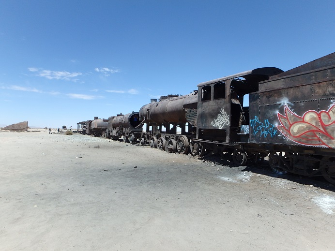 ウユニ三日目はふたりは別れて私は3泊2日のチリのサン・ペドロ・デ・アタカマへ行くツアーに参加しそのままチリ側へ抜けることになりました。10:30に穂高ツアーの店の前に参加者が集合して、またドライブです。途中まではウユニのデイ・ツアーと同じ行程だったので、あっちゃんともちょくちょく顔を合わせました。 ↓まずは「列車の墓」。 ↓広野にメカニックなデザインが転がっていておシャレ。 ↓ブランコをつけた遊び心がいい! 顔は隠していますが欽ちゃんみたいなかんじです。 ↓このツアー...