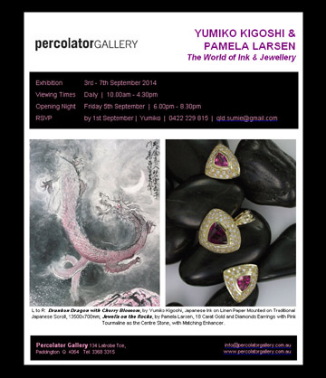 JUGEMテーマ:アート・デザインJUGEMテーマ:オーストラリア来る9月1日より、木越琴遊師範とご友人の二人展が、豪州のギャラリーで開幕します。詳細は、下記URLなどをご参照ください。The World Of Ink & JewelleryYumiko Kigoshi & Pamela Larsen3 To 7 SeptenberOpening Night 5 September、6Pm−8Pm( RSVP By 1 September )Vewing Times 10Am−4:30PmYumiko ...