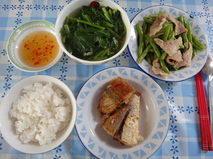 JUGEMテーマ:ベトナム 普段のお昼ご飯、お手伝いさんのお手製です。 お手伝いさんのごはんは揚げ魚率高し!です。 揚げ魚・インゲンと豚肉の炒め物・ほうれん草のスープ。