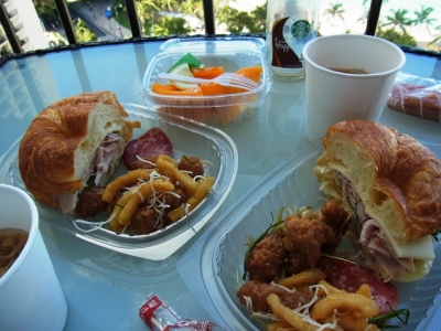 JUGEMテーマ:海外旅行 総合 JUGEMテーマ:ハワイ(オアフ) ワイキキ二日目の朝。 昨夜ABCマートで買っておいたデリとパパイヤ、瓶入りスタバのコーヒー牛乳、 そして昨夜のレストランの残りで、ラナイで朝ごはん。 これをやりたかったんだなぁ オーシャンビューの醍醐味ですねぇ。 きれいな海を見ながらの朝食です。 ちょうど陰になっているし、風があって涼しい… ちょっと目を離したら、鳥が食事をつつきに来るので注意です。 この日は、ジャミラの購買欲を満たすため、ワイケレアウトレットへ行...