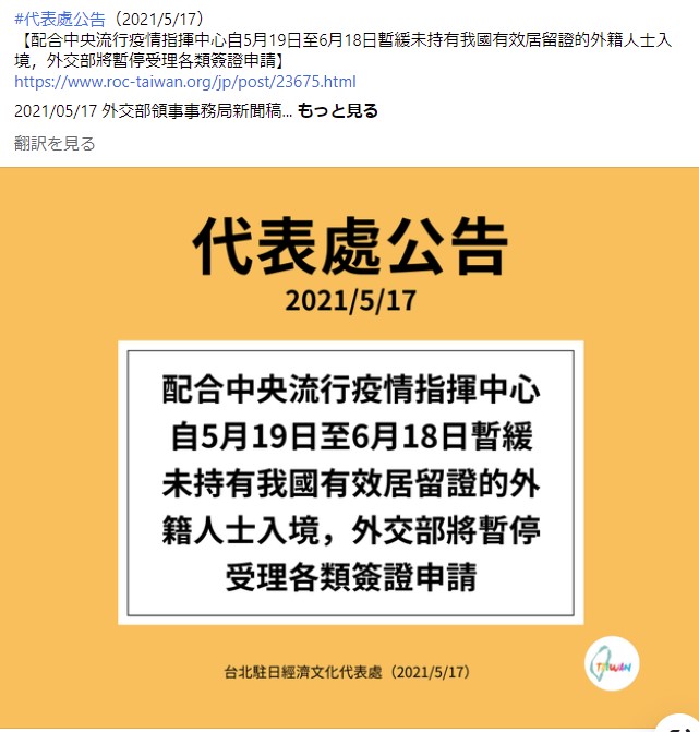 JUGEMテーマ:海外旅行 総合 コロナ感染抑止のため、5/19〜6/18の期間は有効な居留証を持たない外国籍の方の入境は停止と発表されました また、同期間の台北での乗り継ぎも禁止となります 台北駐日経済代表処でのビザ申請も一時停止となるようです 連日の打つ手の速さに感嘆します…