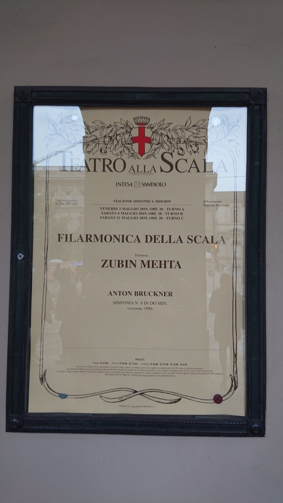 JUGEMテーマ:イタリア JUGEMテーマ:海外旅行 総合 またまた雨が降り出しました。 今日は一日お天気不安定でした。 ホテル前のタクシー乗り場から タクシーでスカラ座へ。 スカラ座といえばオペラ! でも旅行の日程と合ったのは今日だけで コンサートの日でした。 親日家としても知られる巨匠ズービンメータ氏指揮 ブルックナーの交響曲第8番・・・知らない・・・ ...
