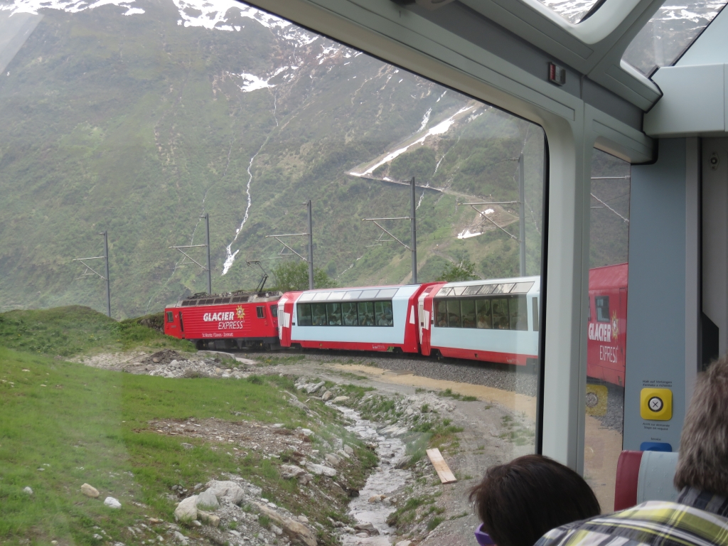 JUGEMテーマ:海外旅行 総合 6月15日(土)、現地ガイドのYさんに見送られ、9:15サンモリッツ発の氷河特急でツェルマット(17:10着)に向かいました。今日はほぼ1日、列車旅となります。 『サンモリッツとツェルマットを結ぶ全長290?、所要8時間の列車の旅。沿線には足がすくむような深い谷があり、広々とした草原があり、急峻な峠があり、91ものトンネルがあり、そして常に雄大なアルプスの姿が車窓に広がる。座席に座っているだけでスイスの美しさを体感できるのがグレッシャー・エクスプレス(氷河...