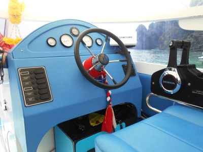 【写真−1 やはり海は天気が良いと最高の表情を見せてくれる】 青空が広がると海の色は透明さを増し、一層透き通った光を跳ね返す。写真−1はバンブー島の上陸した砂浜の水面の様子。タイ特有のけたたましい排気音を撒き散らすロング・テイル・ボートもここでは詩的な感じさえ受ける。 【写真−2 たまには衝突や人身事故も起こすだろうが保険は大丈夫か】 写真−2は乗艇しているスピード・ボートの操縦席の様子。2機の船外機を上手に使って操縦は慣れた様子。プロッター付きのGPSで針...