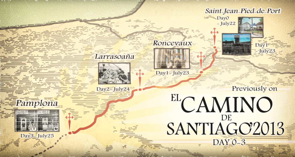 2013年7月25日 カミーノ ー3日目ー 巡礼仲間たちとの心に残る夕食会から一夜明け、3日目はカミーノを歩き始めて初の都市部である「パンプローナ」を目指す。 パンプローナはナバーラの州都で、サン・フェルミンこと「牛追い祭り」でよく知られ、ヘミングウェイの「日はまた昇る」の舞台となった街としても有名だ。 ララソアーニャからは16.4kmしか離れていない為、この街で泊まるとサンティアゴまでの距離は稼げないのだが、是非とも時間を掛けて見て回りたい場所だった。  ...