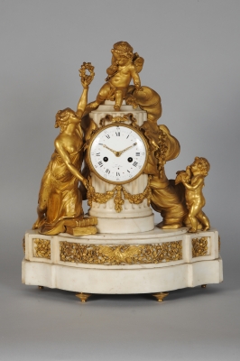 JUGEMテーマ:フランス 1785年にマリー・アントアネットが時計工房「ルバン」に作らせたのは、女性が、天使「アムール」にバラの花輪を差し出しながら愛を懇願しているブロンズ細工の時計です。ロバンのサインと時間と時間を示す文字の間に、小さなユリの花の紋章がついた文字盤は、この時代の椅子の足と同じ、白い大理石の円柱についています。 その円柱を支えるのも同様に白い大理石で、これは王室を表す鷲とバラの花綱模様で飾られています。 女性の足元には本が。この表紙にもやはり百合の紋章...