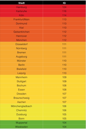 2015年4月にドイツ主要30都市の100,000人超を対象としMein-Wahres-Ich.deというサイト上で行われたIQテストの結果、各都市のIQ平均値のランキングは下画像の通りとなったらしいです。上のリンク先で詳細を見ることができます。ハンブルク, カールスルーエ, ケルン, フランクフルト, ドルトムント, キール, ゲルゼンキルヒェン, ハノーファー, ミュンヘン...と続きます。 また、年代別の平均値は下のグラフのようになったそうです。やはり人間、老いには勝てません。 男女別では、男性平均107・女性平均105と男性の方が僅かに上回っ...
