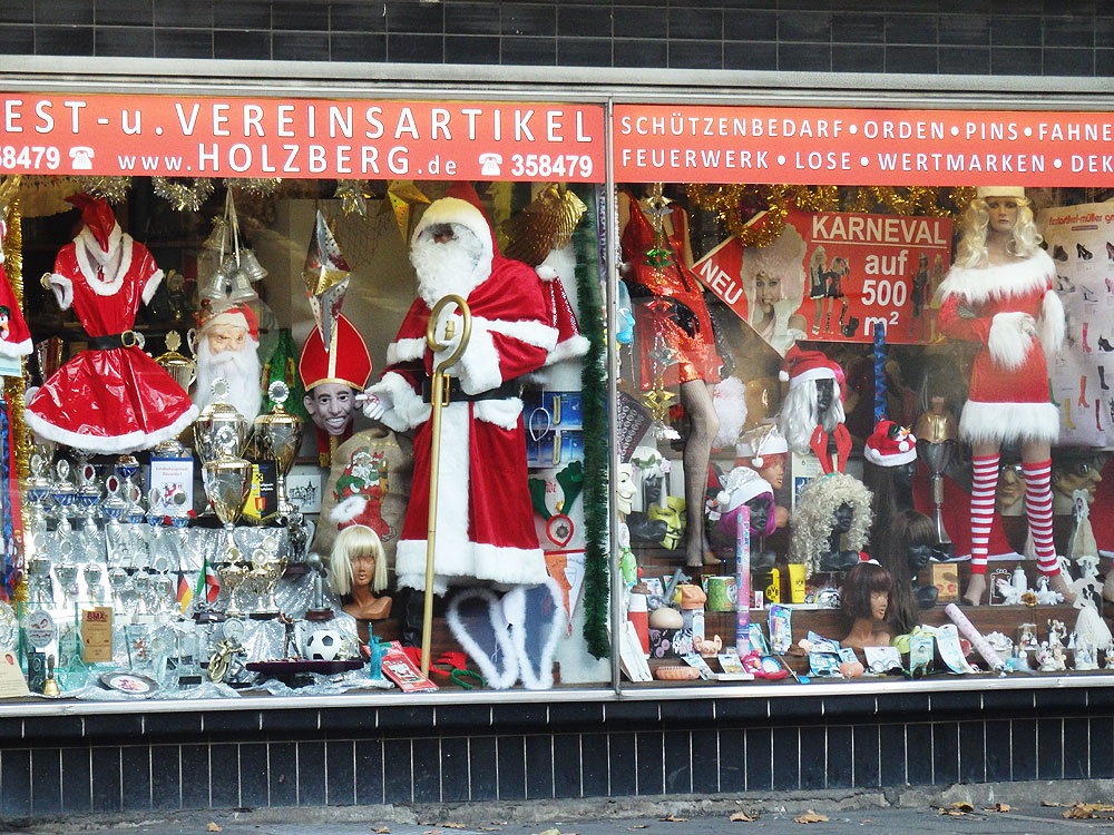 デュッセルドルフ中央駅の裏にある、気になるお店です。う〜ん、気になりますこの店(笑)まさに「キッチュ!!」ある意味で、かなり目立っているので、飾り付けは成功してるのかも?でも、入り口のサンタが怪し過ぎて、僕には入れません、、、トロフィ屋さんかな?それにしても右隅の女サンタの顔が怖い。お店側は、ねらっているのか?このままでいいと思っているのか???こんなサンタさんが家に来たら、子供たちは泣いてしまいますよ〜 。ナマハゲ👹のようなモノか、、、。せめて聖マーティンは終わったんだから...