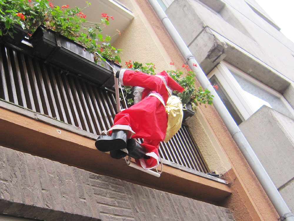 サンタクロースはこんな風に来ないでしょ〜(笑) でも、面白い。最近は煙突のある家も、段々少なくなって気たからねェ。でも、ナワ梯子だと、疲れます。窓を飾る習慣のあるドイツでは、クリスマス用に民家も色々趣向を凝らして飾り立てます。最近ではあまり本気の人は見かけませんが、とてもセンス良く飾る家も残っています。実は、飾った窓の写真も結構持っているのですが、、、これは、部屋の中まで見える場合があるので、とてもUPできませんね。残念です。