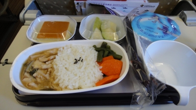 さあ、いよいよ飛行機に乗って台湾に向かいます!今回はトランスアジア航空で行きました。成田から、台北の桃園国際空港までフライト時間約4時間。日本と台湾の時差は台湾が日本の-1時間なので、成田を昼1時に出発して、台湾時間の4時10分くらいには台湾に到着予定です。 フライト時間が4時間という短さでも、ちゃんと機内食が出ました!チキンORポーク?と聞かれ、私はチキンを選択。 ぱぱしゃんは、ポークを選択。 右奥にある「水」って書いてあるのは、一瞬ゼリーか何かと思いましたがもち...