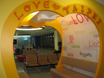 空港についての残っていたお金で少しお土産を買いました。その後出発ロビーに入ってビックリ。すごくラブリー♪♪その代表がこちらの椅子!いろんな言葉で「愛」って書いてます。「ラブ・台北」っていうのも可愛い〜♪スツールにも「ラブ・台北」可愛すぎる〜!!トレイの前の壁もオシャレ。こんなに可愛い空港世界でも無いんじゃ・・!?待ってる間も退屈しませんでした!さて、いよいよ機内へ・・・。近くにいたCAの方が新人だったのか?英語(日本語)の発音がイマイチ・・でした。機内食は「ポークライス」または「さかなパスタ」と言...