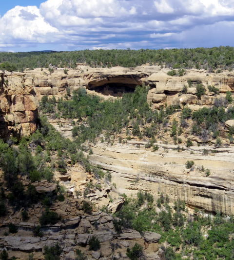 ココペリグッズのお店 ココペリショップ メサベルデの主な遺跡は、断崖住居と呼ばれるものです。 峡谷の断崖に石(レンガ)を使って造られています 集落の跡は、今現在見つかっているもので100以上もあるので ガイドツアーなしでみられるものもたくさん 断崖住居を対崖上から撮ってみた こうやって見ると、断崖住居っていうのがわかりやすいです 上の方の崖の大きな穴の中 ズームで撮るとこんな感じ 昔は崖の上に住んでいたけど、12世紀ごろ崖を掘って移ったそうです。 外敵から身を守るた...