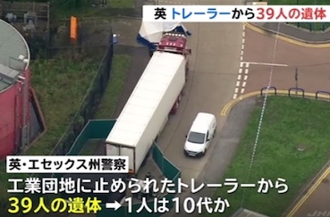 JUGEMテーマ:ヨーロッパ イギリス東部エセックス州でトラックの冷凍用貨物コンテナの中から39人の遺体が見つかった事件で、地元警察は24日、死者は全員「中国人とみられる」と発表し、遺体の移動を始めた。エセックス警察によると、亡くなった39人のうち31人が男性で8人が女性だった。中国の劉暁明駐英大使はツイッターで、職員の一団をエセックスに派遣して警察と接触したことを明らかにし、「地元警察は死者39人の身元を確認中で、まだ特定できていないとしている」と述べた。(略) https://headlines.yahoo.co.jp/hl?a= ...