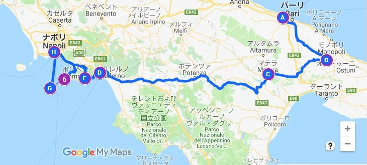 ここで、南イタリア横断の位置関係を復習^^ 成田からローマ乗換で、Aバーリ空港に降り立ち、Bアルベロベッロ泊。 2日目:B~Cをタクシー移動し、Cマテーラ泊 3日目:CからDサレルノへタクシー移動し、バスでEアマルフィへ行き、宿泊 4日目:Eから?ソレントへバス移動しフェリーでGカプリ島へ、宿泊 5日目:カプリ島 ------------------ 青の洞窟はいつでも入れる訳ではない。 風があっても駄目だし、良いお天気でも波があったら入れない。 夏が一番良いらしいが、南イタリアは暑いので、春か秋が良いらしい。 で...