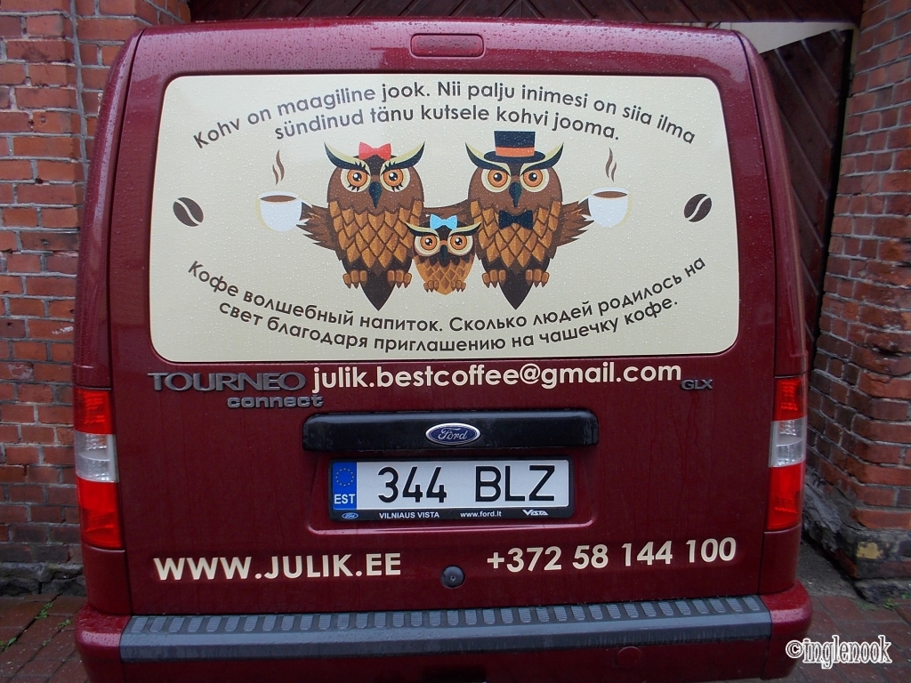 パルヌで見かけたコーヒーショップの車。 コーヒーと親子ふくろうの組み合わせがユニークです。 エストニア語とロシア語が書かれています。 エストニア、パルヌ。 エストニア リネンコットンのトートバッグ
