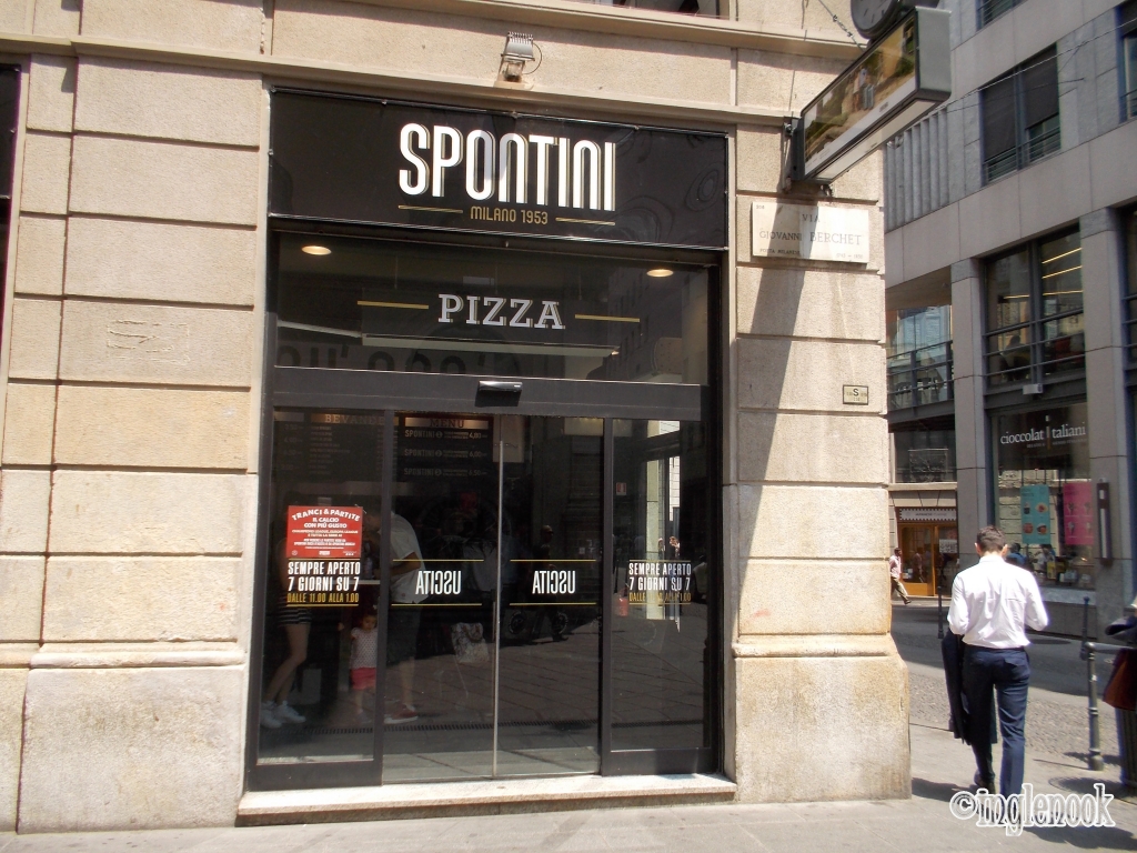 イタリアでもうひとつたのしみだったのがスポンティーニ Spontini の♪ピッツァ♪ ミラノに到着したその日にドゥオーモ 店へランチしに来ました。 メニューは前もって決めてあった、生ハム Prosciutto のピッツァ。 5分ほど焼き上がりを待ってでてきたのがこちら! 大きい!そして厚みがすごい! 食べやすいように切れ目をいれてくれています。 カウンター式のテーブルに地元のみなさんと並んではふはふしつつ、立ち食いです。 たっぷりチーズが濃厚でおいしい〜! おなかいっぱい、お値段4.50ユーロ以上の満足度...