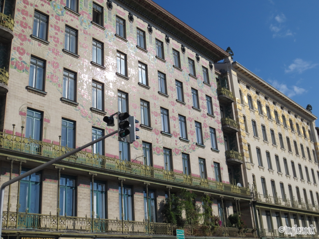 ウィーンで一番大きな市場、ナッシュマルクト Naschmarkt の横に建つ、華やかな装飾のふたつの建物。 ユーゲント・シュティール様式のマジョリカハウス Majolikahaus とメダイヨンハウス Medallionhaus。 マジョリカハウス の赤い花模様はマジョリカ焼きのタイル。 壁一面のタイル装飾は見ごたえがあります! バルコニーの細工も凝っています。 メダイヨンハウスの金色のメダル装飾にはひとつひとつ異なった少女像が描かれているそう。 高くて遠くて、確認することができませんでした! どちらもウィーン生まれの建築家...