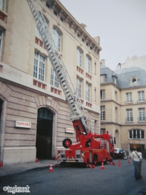 レ・アル des Halles 近く、教会裏にある消防署。 はしご車が点検中。 急な角度、狭い幅。 長さもかなりあります。 想像するだけで高所恐怖症で胸がざわつきます。 消防士のみなさん、お疲れ様です! フランス、パリ1区。 エッフェル塔がデザインされたミニカップ スプーン付