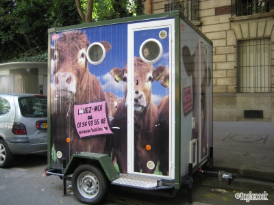 パリの街を散策中に見かけた、不思議な車。 リアルだけどかわいらしい牛たちの写真が目を引きます。 丸い窓もついている。。。 調べてみたら、イベント時などに設置する、簡易トイレのよう。 なるほど、ドアらしきものがありますね。 。。。でも、なぜ牛?? フランス、パリ。 フランスのてんとう虫のアップリケ 紫