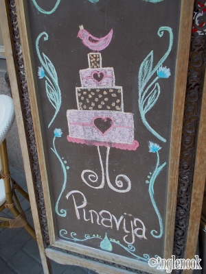 ヴィリニュスの旧市街散歩。 ランチを簡単にすませようと、カフェで軽食を食べることにしました。 ♪ ピナヴィヤ Pinavija ♪ 店頭にスイートな手描きの看板。 店内もとてもスイート! 白いテーブルとイス、壁紙はフラワーモチーフ。 店員さんはみな、ケーキのイラストが描かれたおそろいのかわいいエプロンをつけています。 カウンターにはおいしそうな手作りケーキがたくさん! どれにしようか迷ってしまい、うしろに並んでいる人にオーダーの順番をゆずりました。 キビナイとベリーのムース、そして...