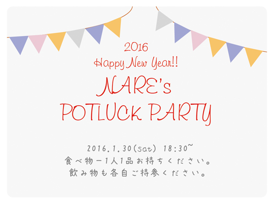 여러분!! 새해 복 많이 받으세요. 2016年もよろしくお願いします。去年の新年会と同じようにポットラックパーティーの形式で新年会を行いたいと思います。お料理、デザート、フルーツ等を一人一品お持ち下さい。買ったもの、作ったもの何でも構いません!お好きな飲み物も各自ご用意ください。日時: 2016年1月30日 18:30~場所: 高槻ワークホテル7階 会議室 (https://www.workhotel.jp/roof_garden/index.htm)締め切り:1月27日(水曜日) 22:00時参加...
