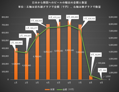 JUGEMテーマ:韓国 今日は10/30に財務省が発表した9月の品目別貿易統計で韓国向けビールの輸出が激減したことを取り上げ、「韓国へのビールの輸出額が▲99.9%と激減したことについて」と題して論説します。 下記は産経新聞の記事です。 『産経新聞 2019/10/30 13:35 韓国向けビール輸出 99・9%減 不買運動が影響 品目別貿易統計 財務省が30日発表した9月の品目別の貿易統計によると、韓国向けのビール輸出額は前年同月比99・9%減の58万8千円だった。日本政府が7月から...