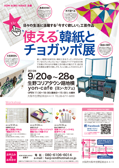 9/20~28の期間 大阪コリアタウンのヨンカフェで 新しい展示会とワークショップが 開催されます! タイトルは 「9/20~28使える韓紙とチョガッポ展」 韓紙、韓布を 実際の暮らしで楽しんでみよう!と KOM KOMI HANJIの金雅子先生を筆頭に 3つのワークショップと展示会が 繰り広げられます。 9/21 中野啓子先生の 楽しく気軽に作れる 「韓紙のポジャギ」は すでにご予約満員御礼です! いや〜人気ですね♪ 早々たる講師陣と 貴重な作品に 出会うことができますヨ。 同じ暮らしにフィットする韓国でも...