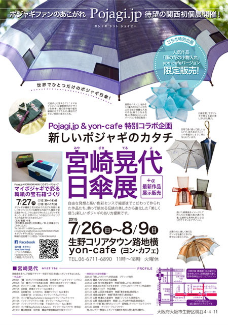 ピンクホランイの夏イベント日 7月26日から ヨン・カフェで 新しい展示会が始まります! ポジャギファンのあこがれ Pojagi.jpの宮崎晃代さんの 日傘展です! ふだんは関東で活動されている Pojagi.jpさん 関西では初の個展となります。 ポジャギで日傘 ナンテ響きだけでも ステキですよね〜 すべて1点モノだとお聞きして 今から拝見するのが とても楽しみです♪ この夏は ポジャギの日傘で はんなりと(笑) 憧れますね〜 7月27日には KOM KOM HANJIさんと 特別ワークショップも ...