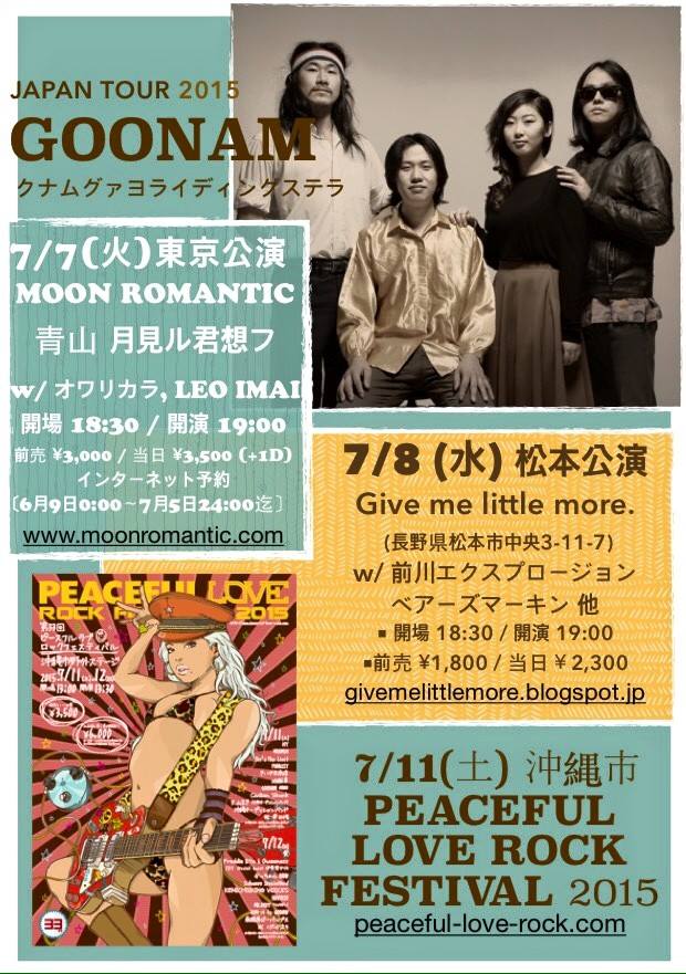 こんばんは!皆さんっ。 今、韓国からGOONAMというバンドがうちに泊まりに来ていて、 明日からGOONAMの日本ツアーが始まります! 東京、松本、沖縄でLIVEをしますので、 興味がある方是非聴きに来て下さいね! 詳細 ↓ ↓ 今回で6度目の来日という彼ら。 これまでにサマーソニックに出演した経験もあるそうです!