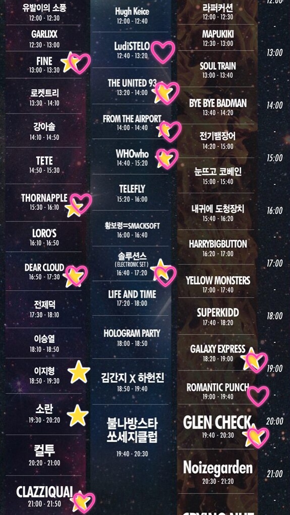 4日にタイムテーブルが発表になってから、 さっそく見たいバンドをチェックし始めました。 ちなみにこんな感じでチェックしています(画像は去年のもの) 肝心なステージ割がカットされて保存されてますけど、 左がXステージ、真ん中CLUB EXIT、右がXステージ…。 あ、去年はXステージ2つあるんですけどフォントの違うXだったんです(ややこしすぎる) 今回のステージに当てはめると、 左がHurom STAGE、真ん中がCLUB EXIT、右がbling STAGEです。 星が見ようと前もって決めていたもの、 ハートが実際に見たものです...