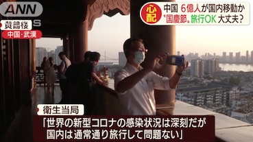 JUGEMテーマ:中国 (略)中国の大手旅行会社は来月1日から8日までの「国慶節」の連休で延べ6億人が旅行に出掛けるとの推計を発表しました。最も人気の観光地には新型コロナウイルスの感染が最初に広がった武漢の名所「黄鶴楼」が選ばれています。衛生当局は「世界の新型コロナの感染状況は深刻だが、国内は通常通り旅行して問題ない」としています。 https://news.yahoo.co.jp/articles/8dabe7aec5f89d3 127cd96e0f397378b3941ba5c ・・・・・・・・・・・・・・・・・・ 確か、C国民は...