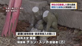 産経新聞の報道によれば、 「福島県警白河署は11日までに、福島県泉崎村の神社でキツネの石像などを壊したとして、器物損壊と建造物侵入の疑いで、住所不定、韓国籍の無職、チョン・スンホ容疑者(35)を逮捕した。 福島県では今月に入り、泉崎村の北側に位置する須賀川市、郡山市、福島市の寺や神社などから、仏像や地蔵像が壊されたとの被害届が相次ぎ、損壊数は少なくとも100体近くに上っている。白河署は関連を調べる方針。 逮捕容疑は、9日夜、同県泉崎村の稲荷神社でキツネの石像2体を壊し、さらに本殿...