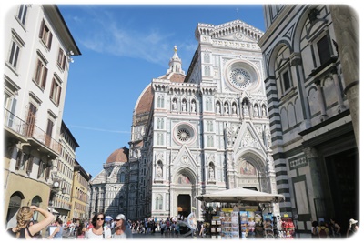 まずはS.M.N駅から観光の中心地、ドゥオーモを目指します。 暑い暑い・・・バスを待つより歩いた方が早そうなので、日陰を選んで歩きました。 すると突然ものすごい人だかりのなか、何かが見えてくるのですが・・・ どどーん!! 予習が少なくてお恥ずかしいのですが、あまりにも唐突で、巨大で、まるで何かのセットのような細かな装飾にびっくり。 これがイタリアなのか!?迫力満点すぎる。圧巻。 一見の価値あり・・・ここだけで円形ドームと鐘楼、洗礼堂もあり、一日じっくりしていられるくらいです。 本当は...