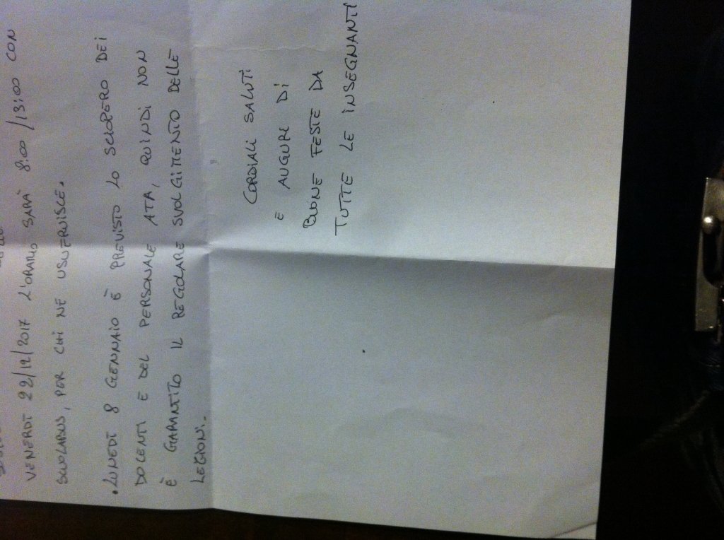 トスカーナからブウオン・ポメリッジョ! お正月気分が全くないイタリア♪今日から普通にお仕事開始です! でもイタリアの学校は冬休み! 2人の息子が通う公立の小学校(トスカーナでは)12月22日が終業式でした。 そして1月7日は日曜日ということで、 今年は1月8日の月曜日が学校の始業式のはずなのですが… 学校からの連絡簿を読んで見ると↓ 始業式=どうやら市職員のストライキ宣言が出ているようで… 当日になるまで【学校あるの?学校ないの?】分かりません(笑) そして今日は...