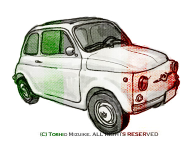 JUGEMテーマ:イタリア ネタに困ったら車の絵を引っ張り出す。 このチンクエチェントが名刺の裏の絵柄です。