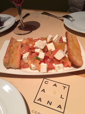 JUGEMテーマ:スペイン ホテルに引きあげ、ちと休む。 到着からここまで突っ走ってきたから、今日は早めに食事。ゆっくり休んでチャージしないと。 [CATALANA]あげいん。 早めの時間帯にもかかわらず、祝日とあってすでに満員。 ダメかなあとあきらめかけるも、一応、列に並んでみる。 どうしようか、他に行ってみる?なーんて、ひそひそ話している間にも手際の良いフロア係がどんどん客をさばいていき、ほどなく奥のテーブル席に案内されて、ほっ。 中に入ってびっくり。店の形はひっくり返した"U"の字形...