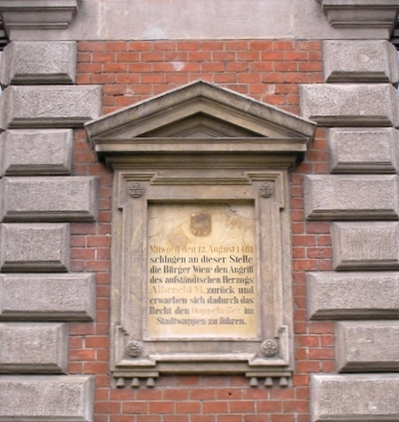 JUGEMテーマ:ウィーン 撮影は2013年10月01日です。 1461年8月12日にこの場所で起きた事件が契機で同年9月02日からウィーンのワッペンとなる『双頭の鷲』について記されてます。ウィーンのガイド試験必須項目ですから公認ガイドなら誰でも知ってます。 【案内の観光ガイドの詳細と申し込み】 http://wien-jp.com/wien-jp/id-nr.php 『にほんブログ村』ランキングに参加してます。このブログが有用だと感じた方はクリックしてくださると幸いです。ありがとうございます。